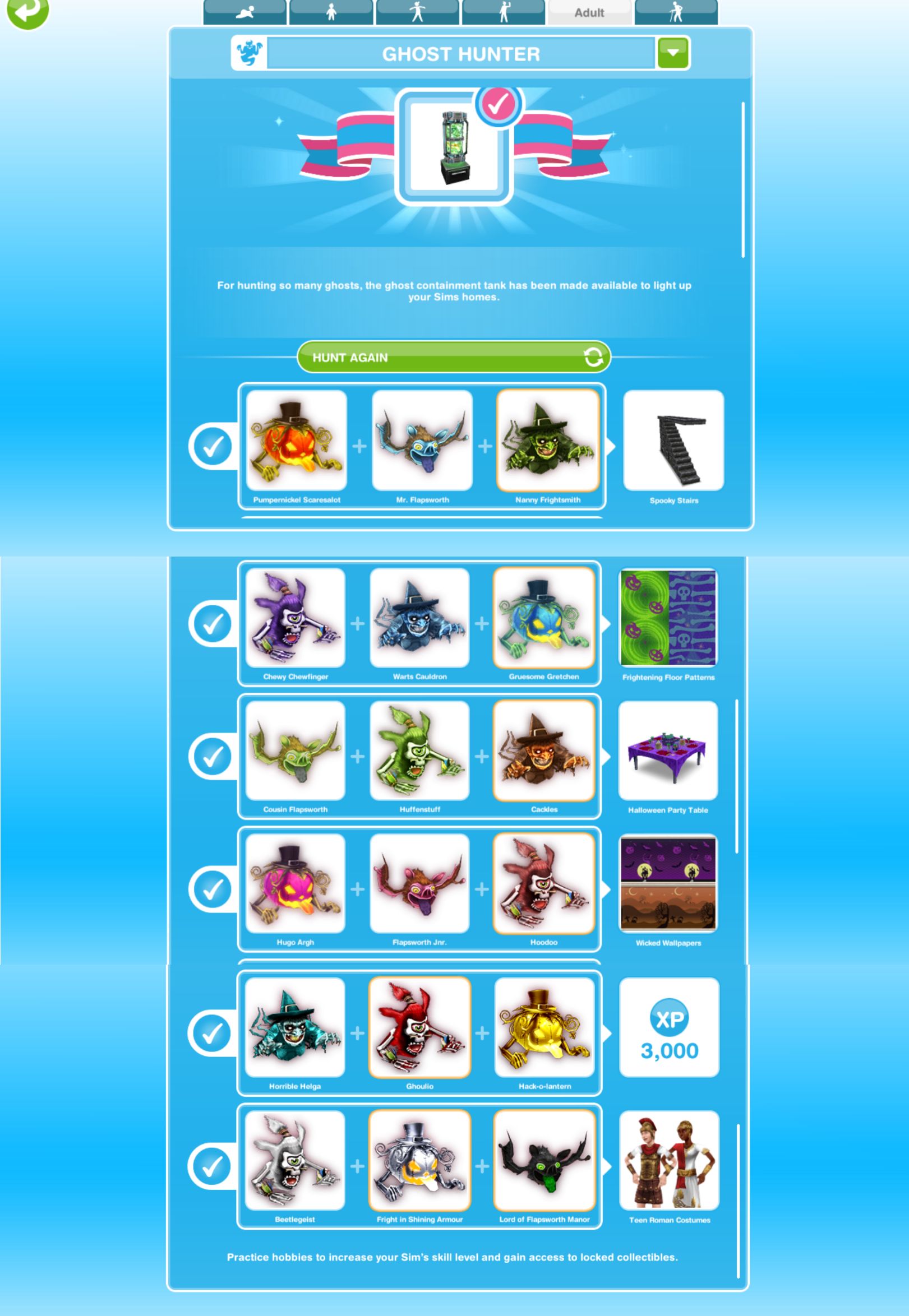 • I think it takes a very long time to complete this hobby, and afterr playing the sims freeplay for about three years ive finally atttempted to complete my collection…. I have two sims ghost hunting in my haunted house. The problem is that i have to check on them every three minutes, and once you’re level 5 or so it takes thirty hunting sessions or more to actually promote to the next level! And indont really have the nerve for that…. Somis it smart tomhave more than one sim hunting or di you have any other tips??