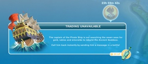 15. So my ship came back, with the Treasure Chest picture clear (not faded out with the words “Trade Now” on it.) I am assuming since I have 2 out of the 3 items to trade (0/2 gold bars) the Pirate must want the gold bar, the one I do NOT have. Because I do not have the opportunity to “Trade Now.” So the ship is sitting there for the next 30 hours until it goes away and comes back, I guess. I’m not giving up 10LP to get a gold bar only to trade it away!