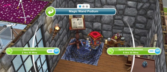 After you purchase your 1 podium choose one sim for the next seven days to continuously do the spell casting. Now, send another sim to a “Friends” town on the party boat and try to find a podium there. If you find one put another sim on there and keep him doing the spell casting hobby. And that’s how you get two sims to do the hobby. Both sims will equally level up and double your odds.