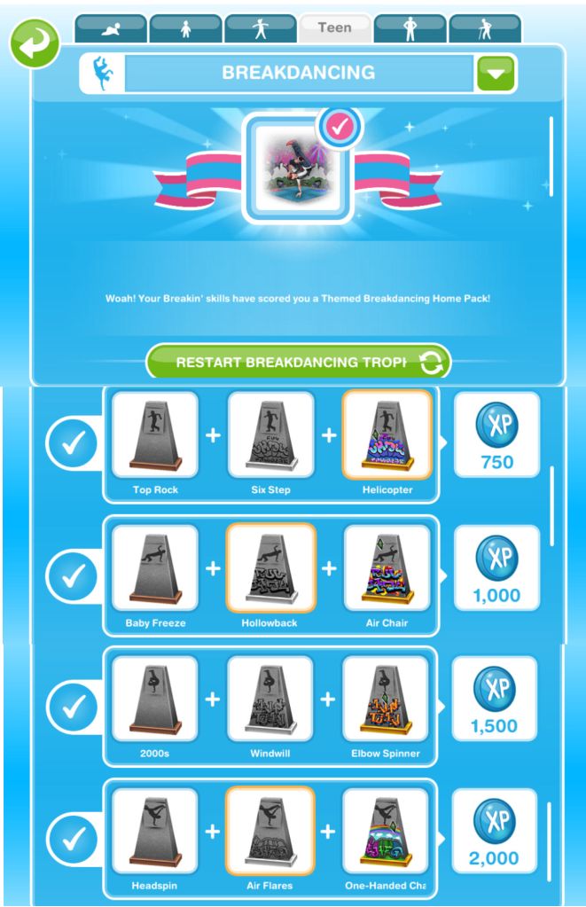 The completed breakdancing collection is shown below, once you complete the collection you need to click ‘start a new collection/restart breakdancing trophies’ at the top of the hobby collection screen, this clears the board so you can complete the collection again to earn more rewards (you will only get the option to restart the hobby collection when you have completed the collection):