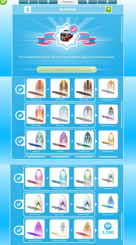The completed surfing collection is shown below, once you complete the collection you need to click ‘start a new collection’ at the top of the hobby collection screen, this clears the board so you can complete the collection again to earn more rewards (you will only get the option to restart the hobby collection when you have completed the collection):