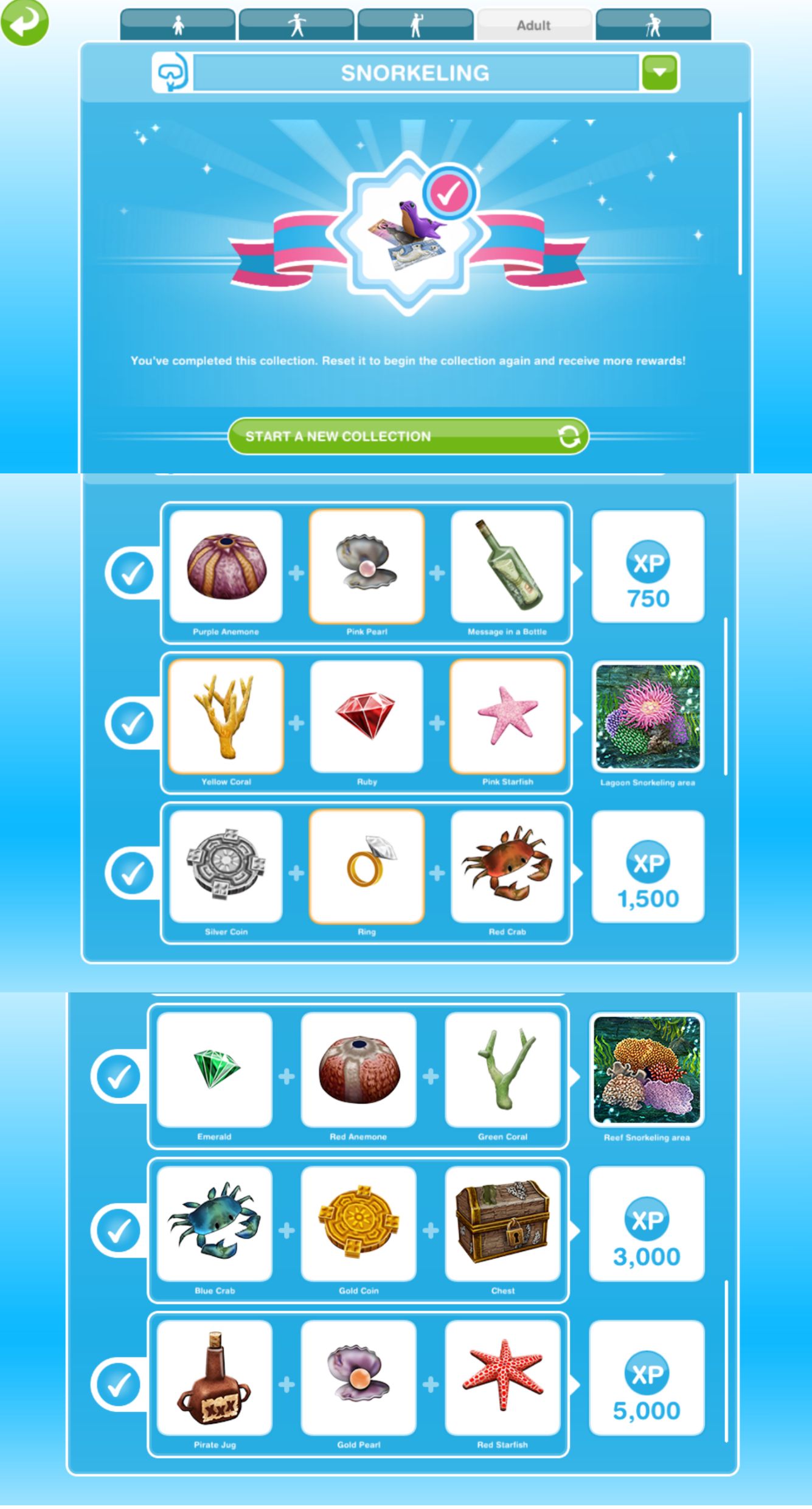 The completed snorkelling collection is shown below, once you complete the collection you need to click ‘start a new collection’ at the top of the hobby collection screen, this clears the board so you can complete the collection again to earn more rewards (you will only get the option to restart the hobby collection when you have completed the collection):