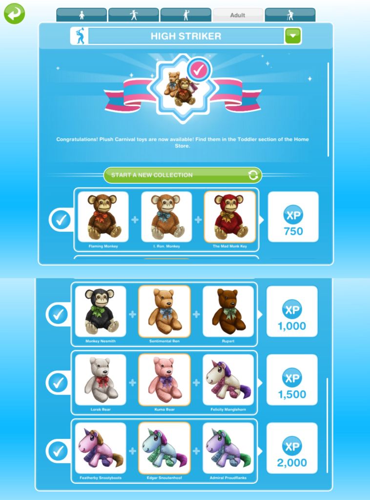 • The first time you complete the collection you unlock plush carnival toys which can be found in the toddler section, Flaming Monkey costs S28,000, Sentimental Ben costs 20SP and Felicity Manglehorn costs 10LP: