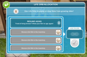 2.A life orb allocation pop up will appear, here you can see all the orbs you have stored or are working towards right now, select the orb you want to use, then click the green tick. It shows you where it says age pause how long you will be pausing your sim for.
