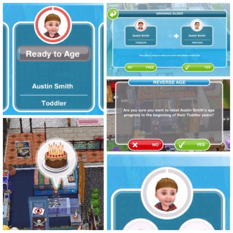 How does it work? To reverse their age all you need to do is wait until their time is up and the birthday cake appears above their head. Click on the birthday cake and the growing older pop up will appear, just click NO if you do not want them to age. It will then ask you if you are sure you want to reset them to the beginning of that life stage, click yes if you do. Once you click yes the circle around their face on the simtracker will be empty ready for them to start ageing again!