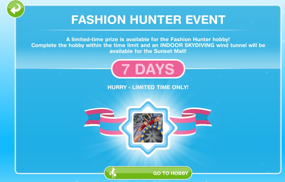 Once built the time limit for this hobby will begin and your adult and teen sims will have to complete the hobby collection in 7 days to unlock the indoor skydiving wind tunnel at the mall: