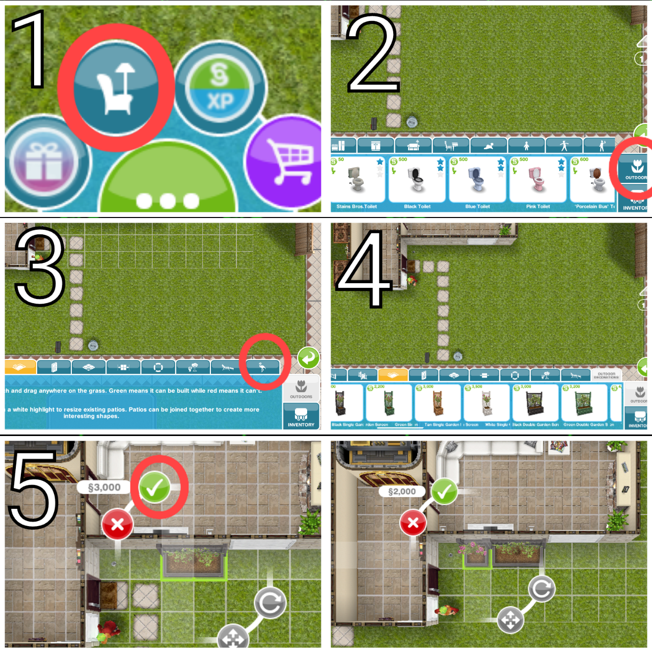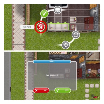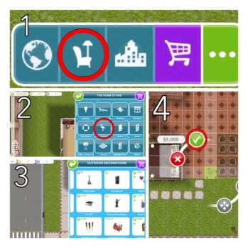 - Click on the item, find a space on the house lot to place it and click on the green tick to buy (it will flash red and the green tick will be greyed out if you cannot place the item)
