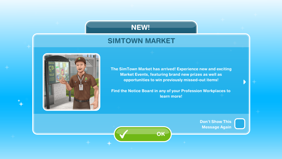 The simtown market has been added to the October 2016 update of the sims freeplay. If you have finished upgrading all the workstations at a profession workplace and have been wondering if there is any point in sending your sims to work to collect resources or if you have reached your limit on the resources you can store, and find it a waste just to sell them- then this update is for you!