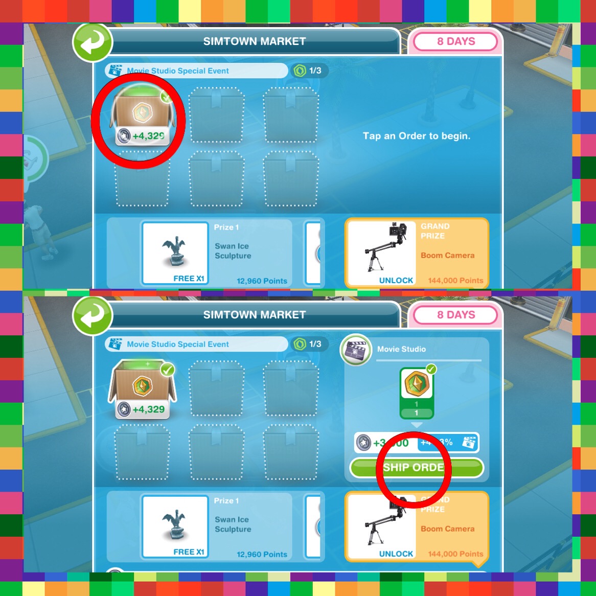• View the Simtown market (go to the Movie Studio (this may be a different profession workplace if you complete this tutorial during a different event) and click on the symbol of the person holding a parcel)