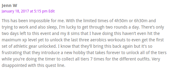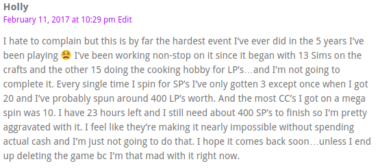 I agree with you, these events have become impossible to beat without spending money. I don’t even attempt them anymore after being ripped off on the spa because I was forced to pay to not lose what I had earned before time ran out. And now we have the pregnancy event. I noticed after I completed the event the first time that the other Sim’s needs are now plummeting, so the idea is that we’re supposed to replace all of our current Sims with the new and improved ones. So I tried a second baby. It ends tomorrow and the helper needs are only at about 70%, which means I would have to purchase social points to successfully finish this one, so…it’s not going to make it. So after all I’ve done for 8 days will be wasted tomorrow on, I assume, just another needy, regular old Sim. Thanks a lot to the makers for that joke. This has really ruined my interest in the game. I’ve noticed the pet’s needs for attention are also dropping quickly now, so it’s time to thin the herd on pets and Sims. I’m not doing the pregnancy thing again since it’s impossible and therefore, no longer any fun. I can ‘buy’ happiness on tangible things. The requirements are ridiculous in needing 13 Sims for some tasks that require an additional 13 Sims to complete them with! It’s just about greed now and this pregnancy event has proven that true.
