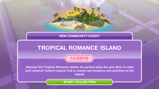 This is the second time this community event has been available, it is only here for 14 days and the aim of it is to collect enough fruit from special new plants (found in the event tab of buy mode) to unlock the Tropical Romance Island and build all the places on the island.