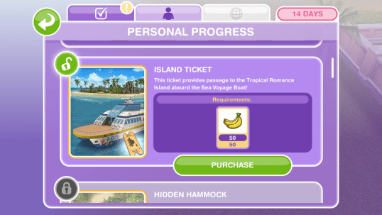 Buy tropical romance island ticket- go back to the personal progress tab and click purchase on the island ticket