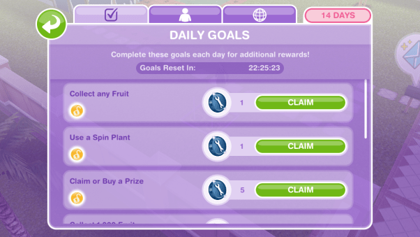 TIP: if you have already claimed or brought a prize that day maybe wait until the next just incase you don’t have enough fruit or coins to buy or there isn’t one to claim the next day, this way you will still be able to complete all the goals and earn your bonus constructor coins!