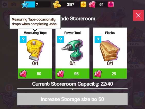 You will need items to increase your storage, these will change each time you increase the storage. If you don’t know how to find an item click on the question mark and it will say something like ‘measuring tape occasionally drops when completing jobs’ this means when you complete jobs you have a chance of finding measuring tapes but you aren’t guaranteed to find them so it can take some time!