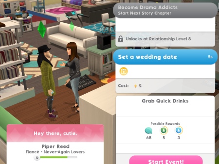 1.Set a wedding date- 5 seconds, costs 2 energy (select the blue interaction on your sim’s partner) Reward: 25 coins