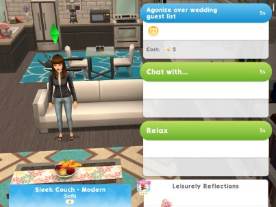 7.Create a wedding guest list- 5 seconds, costs 2 energy (select the blue interaction on a sofa) Reward: 25 coins