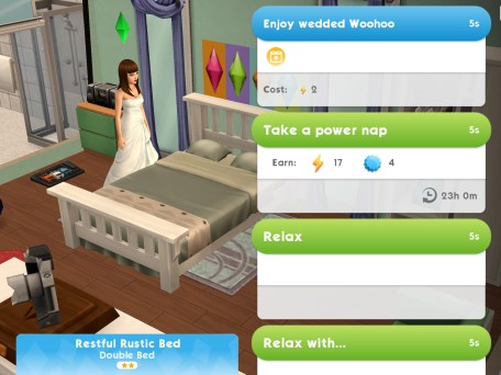 15.Enjoy wedded Woohoo- 5 seconds, costs 2 energy (select the blue interaction on a double bed) Reward: 25 coins