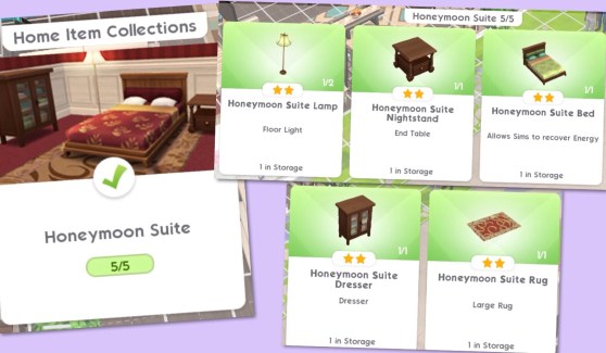 If you complete the quest in the time limit you unlock the Honeymoon Suite items which includes a bed, lamp, nightstand, dresser and rug. The first one of each is free and can be found in your storage section: