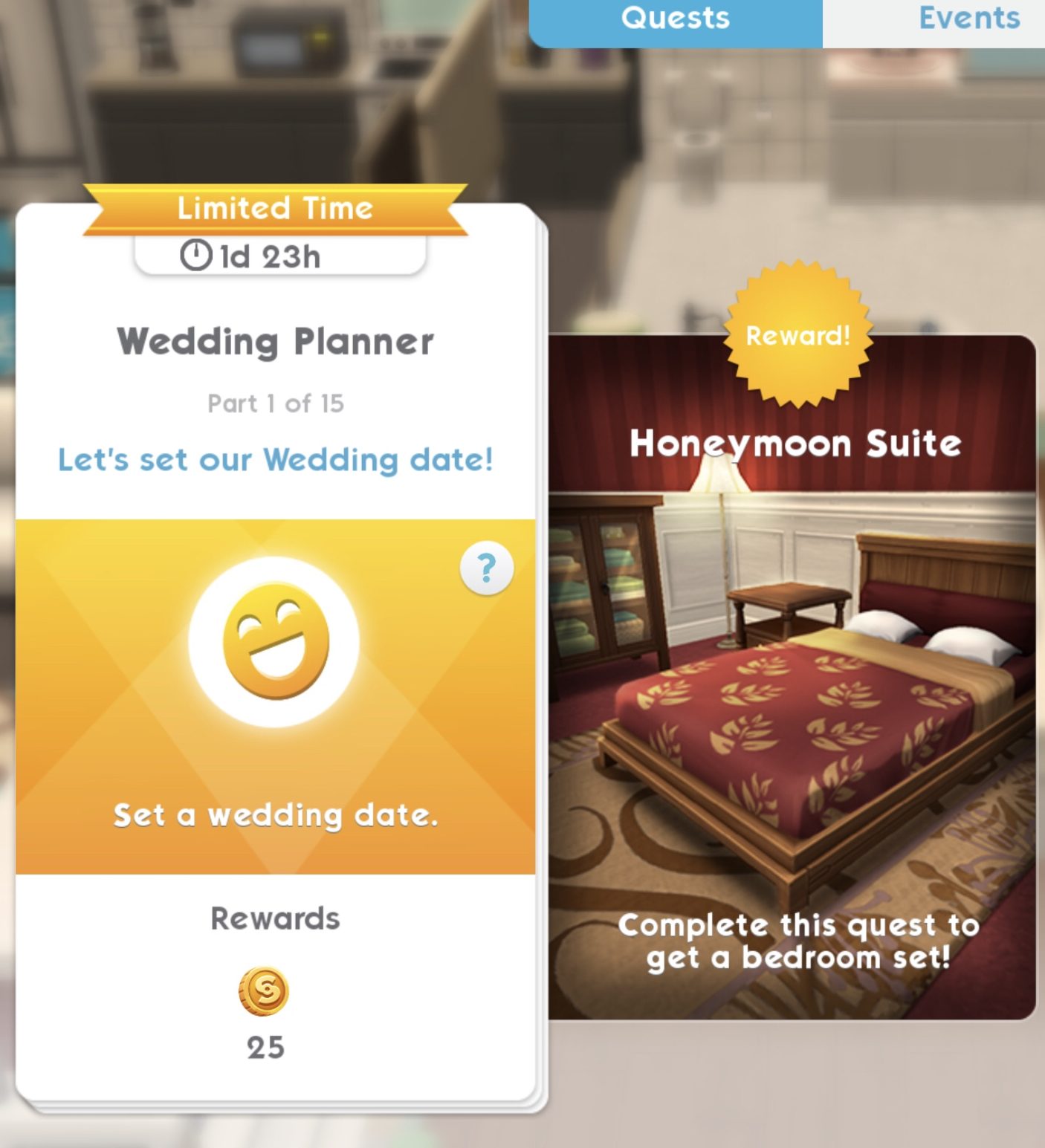 14.Complete the ‘Here Comes the Wedding’ event at Home- takes up to 8 hours to complete (will take up to 4 hours if you use two of your sims to complete this)* (select the event on your sim’s partner) Reward:5 simcash, 25 coins and 10XP