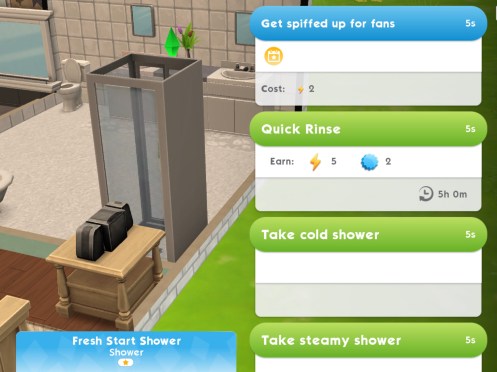 1.Get spiffed up for fans- 5 seconds, costs 2 energy (select the blue option on the shower) Reward: 25 coins
