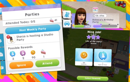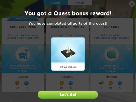 6.Complete 3 relationship events (complete 3 events with 3 sims) Reward: 25 coins and 10XP