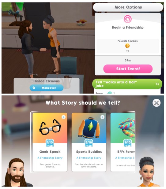 3.Start a friendly story (select the begin a friendship event with another sim, once complete select one of the stories to tell with that sim) Reward: 25 coins