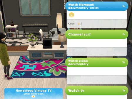2.Watch Illamanati documentary series on TV- 5 seconds, costs 3 energy Reward: 25 simoleons