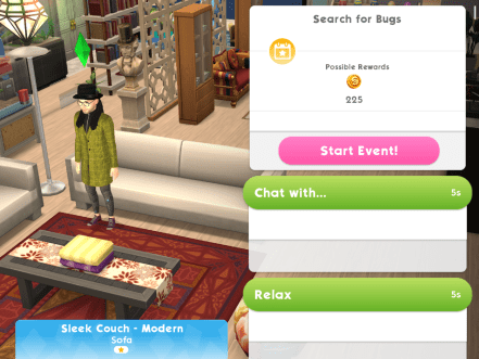 7.Complete the ‘Search for Bugs’ at home event (click on a sofa to start the event) Reward: 25 simoleons and 10XP