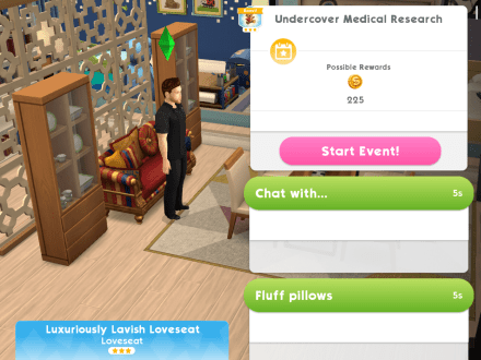 11.Complete the ‘Undercover Medical Research’ event (click on a sofa to start the event) Reward: 25 simoleons and 10XP