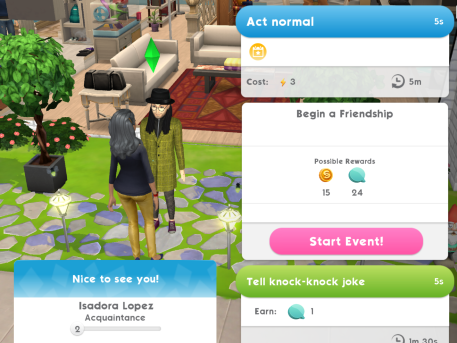 13.’Act normal’ with 3 sims- 5 seconds, costs 3 energy each Reward: 25 simoleons