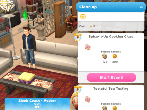 Clean around furniture 3 times- 5 seconds, costs 3 energy each (click on a sofa and select the option 3 times)