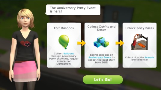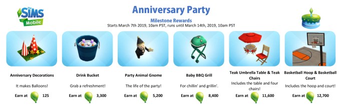 Celebrate the one year anniversary of The Sims Mobile with this time limited event that starts at 10am PST on Thursday 7th March. The aim of this event is to earn enough balloons to buy the anniversary boxes to unlock all the best items of the last year in the 7 day time limit. There is also a quest to complete that unlocks a karaoke machine!