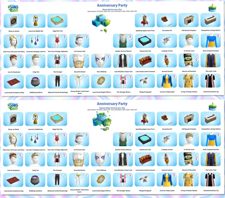 - Deluxe Mega Anniversary Box– costs 75 simcash (this box also contains all the items but you have a better chance of getting rarer items with this box)