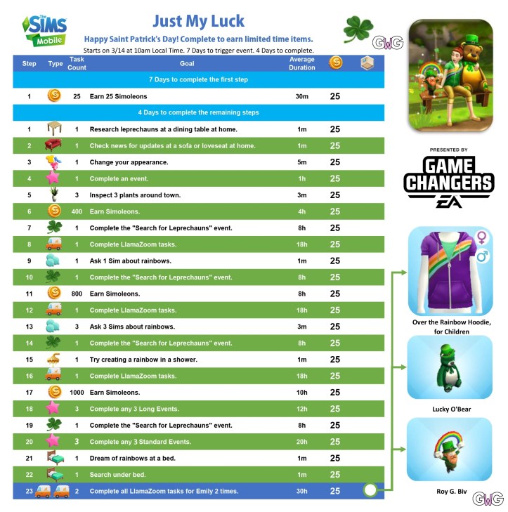 A time limited quest to celebrate St Patrick’s Day starts at 10am on Thursday 14th March, if you complete this quest in the 4 day time limit you unlock some cute rewards!