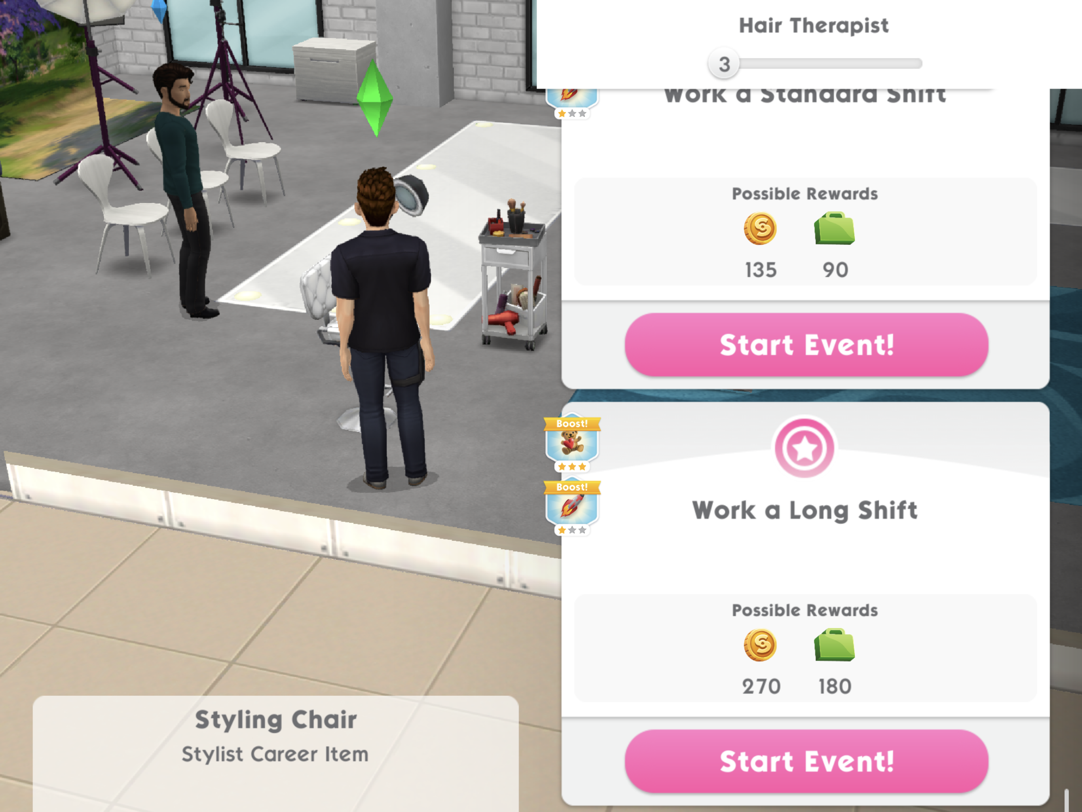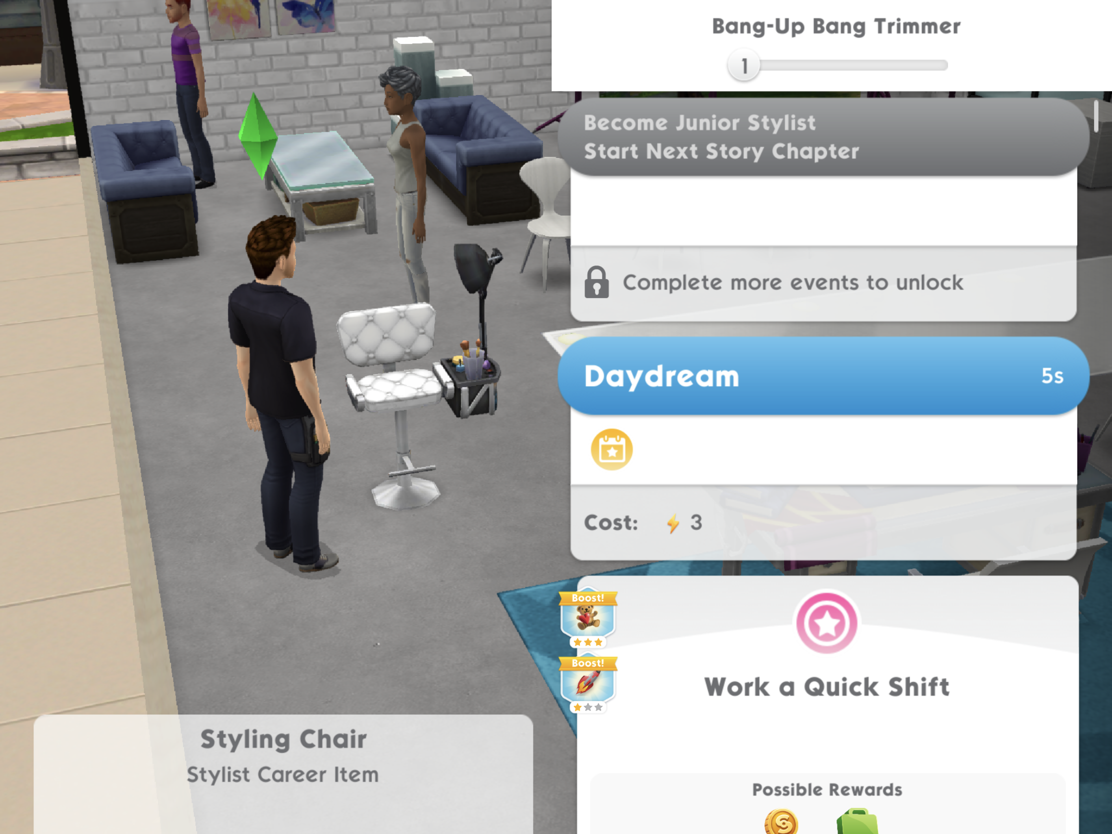 4.Complete a Stylist Career event- takes up to 55 minutes to complete* (click on the stylist chair to begin) Reward: 25 simoleons