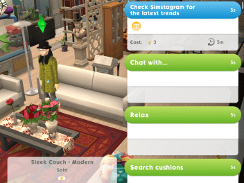 16.Check Simstagram for the latest trends (on a sofa)- 5 seconds, costs 3 energy Reward: 25 simoleons