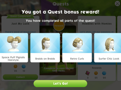 If you complete this quest in the time limit you unlock the Space Puff Pigtails Hairstyle for children sims (sorry I don’t have any children in my household at the moment so I don’t have a picture of this yet) the Braids on Braids and Retro Curls hairstyles for female adult sims and the Surfer Chic Look for male adult sims: