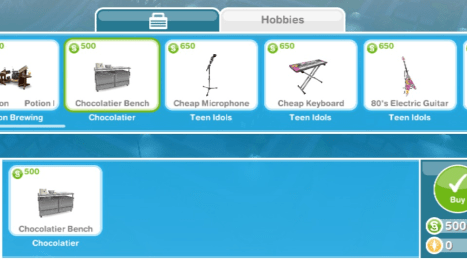 - Buy as many chocolatier benches as possible, the maximum is 15 so you could have 15 sims completing this hobby at once