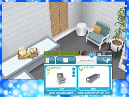 Both the Teal Sunside Chair and Grey Sunside Coffee Table can be found in the living room section, the first one is free then costs S275,000 (chair) and S286,000 (coffee table)