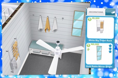 Both the White Big Towel Rack and Gold Rubix Mirror Single can be found in the decoration section, the first one is free then costs S95,000 (rack) and S160,000 (mirror)