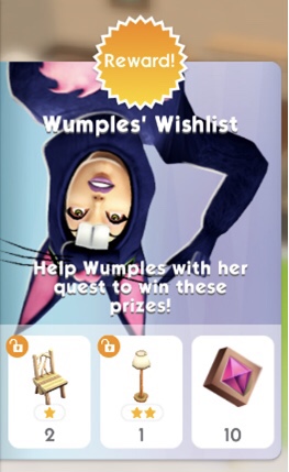 Wumples has come from The Sims Freeplay to see what is going on in The Sims Mobile and she has brought with her a new quest Wumples Wishlist! Completing this limited time quest in the 4 day time limit unlocks chairs and a lamp and 10 fashion gems.