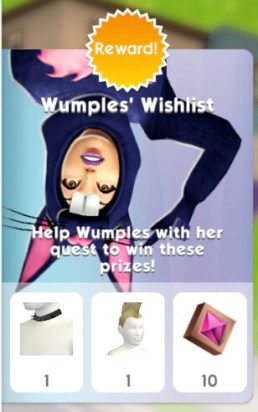 Wumples has come from The Sims Freeplay to see what is going on in The Sims Mobile and she has brought with her a new quest Wumples Wishlist! Completing this limited time quest in the 7 day time limit unlocks a choker necklace for male adult sims, a hairstyle for male adult sims and 10 fashion gems.