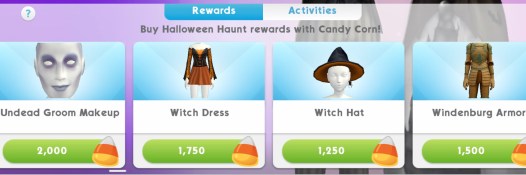 4.Say trick or treat to 5 sims- costs 3 energy (select the interaction on another sim, can only be completed every 2 minutes with the same sim, use different sims to complete this quicker) Reward: 115 candy corn