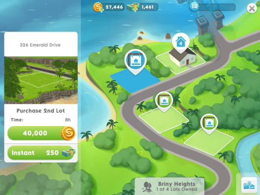 - 3rd lot- costs S100,000 and takes 2 days to build (but can spend 500 simcash to build instantly instead)