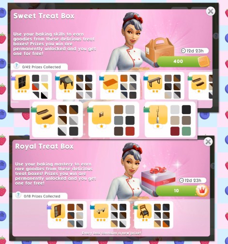 There are 42 Sweet Treat Boxes to open with 400 Sweet Treat Tokens each time and 18 Royal Treat Boxes to open with 10 Royal Treat Tokens each time: