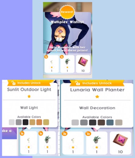 Wumples has come from The Sims Freeplay to see what is going on in The Sims Mobile and she has brought with her a new quest Wumples Wishlist! Completing this limited time quest in the 5 day time limit unlocks the sunlit outdoor light, lunaria wall planter and 10 fashion gems.