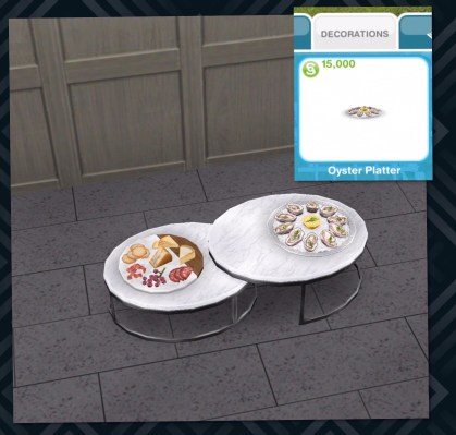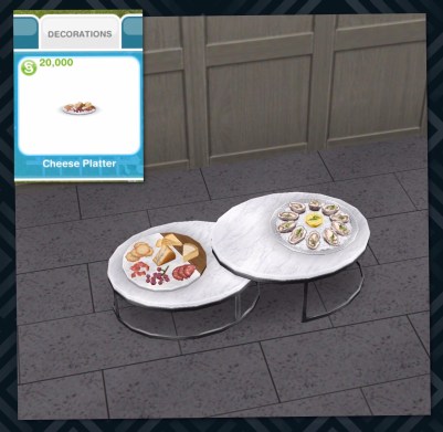 They have updated this so your sims can now interact with these platters; on the cheese platter sims can delicate nibble for 4 minutes and gorge on snacks for 48 minutes, on the oyster platter sims can gulp oysters for 4 minutes and savour seafood for 48 minutes