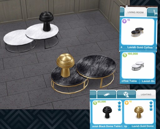 Lavish Gold and Black Coffee Tables- living room section, first one of each is free then Gold costs 15SP and Black costs S150,000