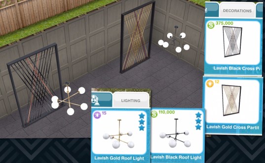 Lavish Black and Gold Cutout Partitions- decorations section, first one of each is free then Black costs S155,000 and Gold costs 12SP