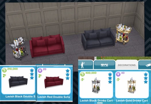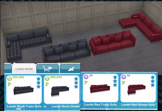 Sophisticated Seating: requires 16,500 pottery, 17,500 jewelry, 17,500 glassware and 175 constructor coins to buy Lavish Black and Red Triple Sofas- living room section, first one of each is free then Black costs S250,000 and Red costs 30SP